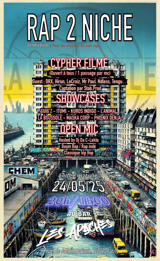 Rap 2 Niche est une philosophie, une école. La vraie école, la « True School », celle qui vise un impact indélébile. Celle qui préfère être écoutée pendant vingt ans par la même personne plutôt que de ne laisser qu’un vague souvenir au plus grand nombre. La Boussole a organisé plusieurs événements scéniques gratuits et ouverts à tous : des concerts « RAP 2 NICHE », visant toujours à redorer le blason de l’âge d’or du hip-hop en alliant innovation et tradition. Sur scène, le collectif défend cet art de puristes, malheureusement relégué dans l’ombre de superproductions urbaines devenues aussi insipides que nocives par les valeurs qu’elles véhiculent.